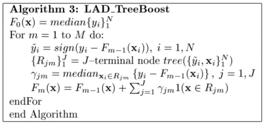 $$\gamma _{jm} = \arg \min_{\gamma} \sum_{x_i \in R_{jm}} |y_i – F_{m-1}(x_i) – \gamma|$$
